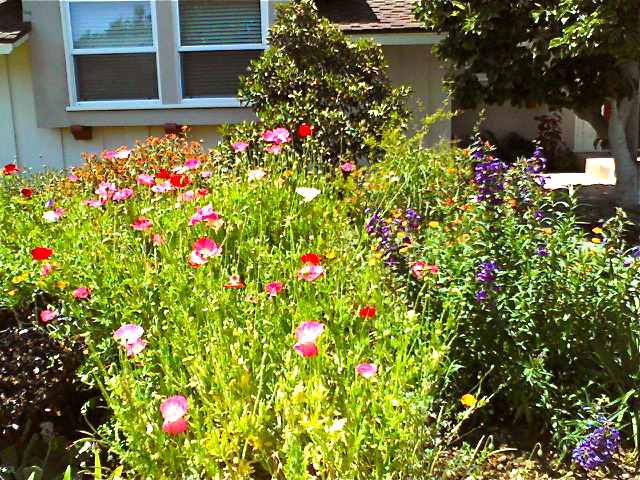 I leave you with a picture of my neighbor’s front garden, an oasis of color and bloom. (It’s also a favorite hangout of several neighborhood cats, although none are in residence in the photo.) Makes me almost wish I could garden too, but my thumb remains resolutely brown!