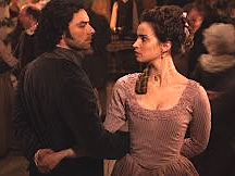 I could wish this Ross was less of a susceptible sap where Elizabeth is concerned. Some of this is unavoidable: Elizabeth is always a bit of an Achilles heel for Ross, but nowhere in the books is there a scene where they trade longing or flirtatious looks while dancing, or where he believes that Elizabeth is all set to leave Francis for him and is mortified to discover he’s misread the whole situation (the 1970s series is a different kettle of fish, and I’m no more fond of that plot twist than Graham himself was). I did appreciate Turner’s Ross having a mini-epiphany about his futile Elizabeth fantasies and asking Demelza if he had the words “Half Wit” branded on his forehead. Being less deferential than she, I was tempted to respond, “No, only STAMPED!”